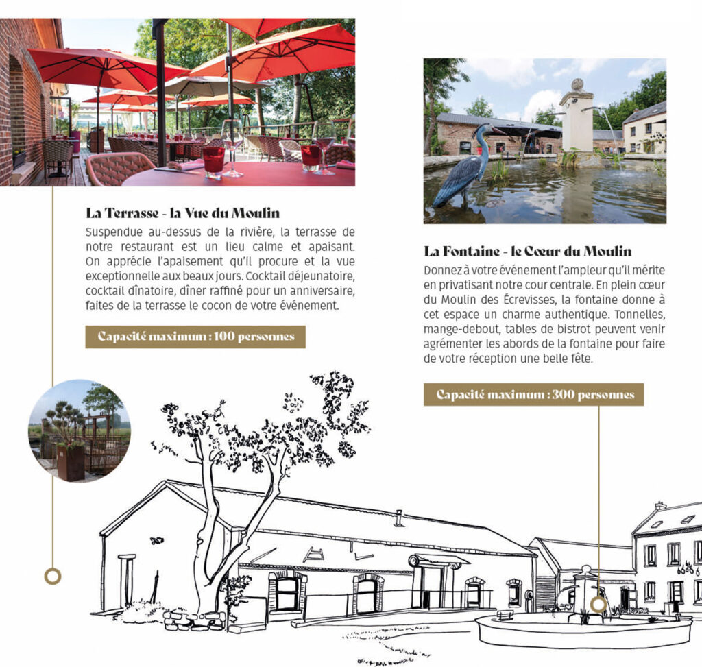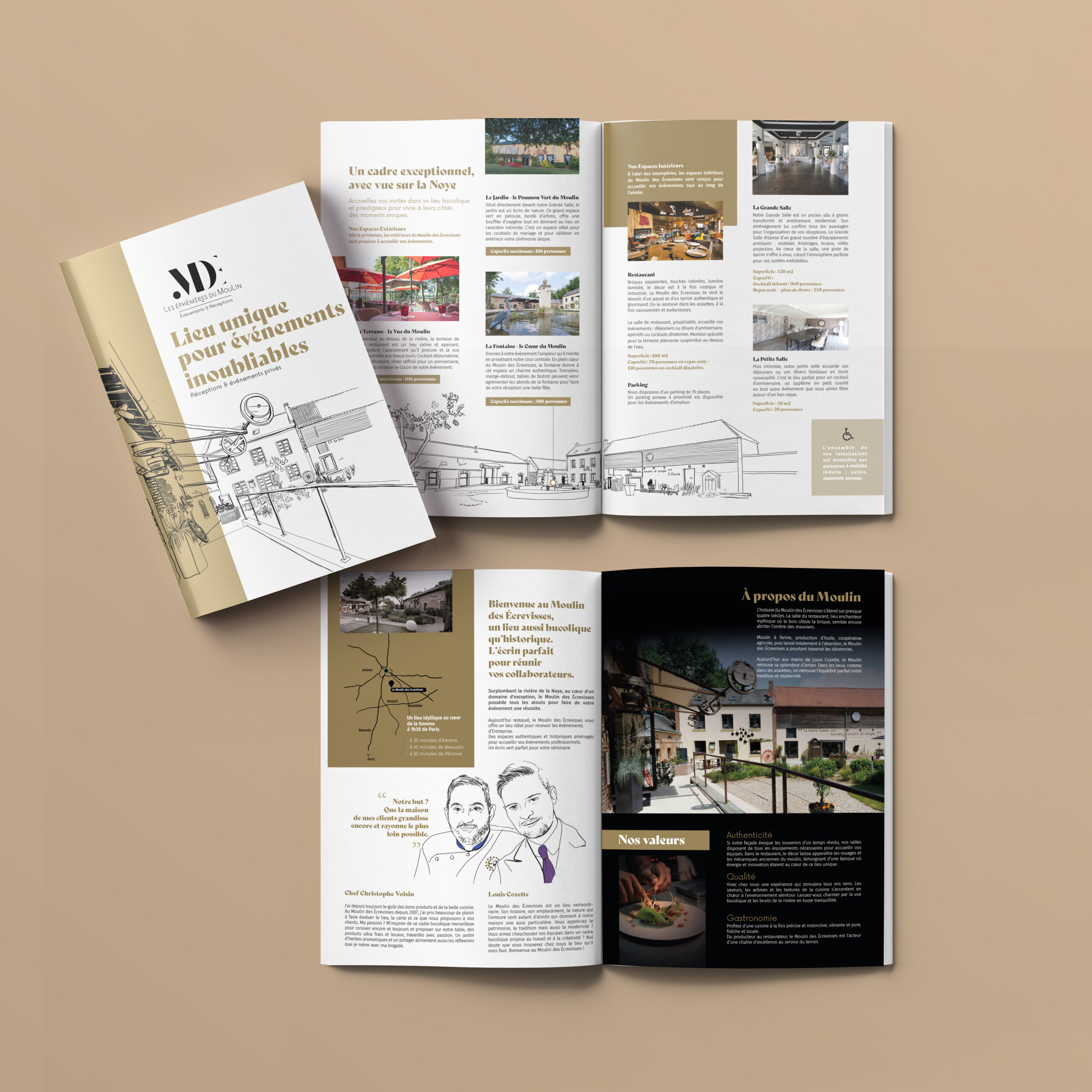 Le Moulin des Écrevisses a souhaité créer une brochure à destination de ses clients professionnels de sorte à leur présenter toute l’étendue de leurs services ainsi qu’aux clients particuliers qui rêvent de voir le plus beau jour de leur vie devenir réalité dans ce lieu magique.